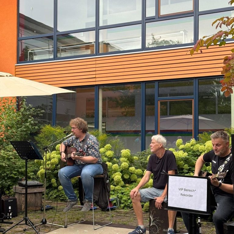 Wir beginnen und die Geräuschkulisse sich unterhaltender Personen übertönt den Gesang, so dass ich mich kaum höre. Heute merke ich wieder, dass ein Techniker für den Sound seine Daseinsberechtigung hat. Leider haben wir heute keinen. Und so spielen wir uns durch unser Programm, quasi unbeobachtet. Das durchwachsene Wetter tut sein Übriges. Vielleicht sind wir auch mit anderen Erwartungen an den Gig gegangen. Auf jeden Fall ist es eine Erfahrung, die wir machen mussten.
